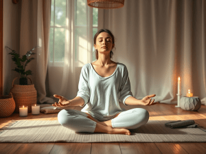 You can sit cross-legged on the floor using a yoga mat, towel, or rug, or simply settle into a chair or your bed. The key is to be upright but relaxed. Good posture helps keep you present, and a cushion can offer extra support. If you’re sitting on a chair or bed, choose something that supports your back so you’re not sinking in too deeply.